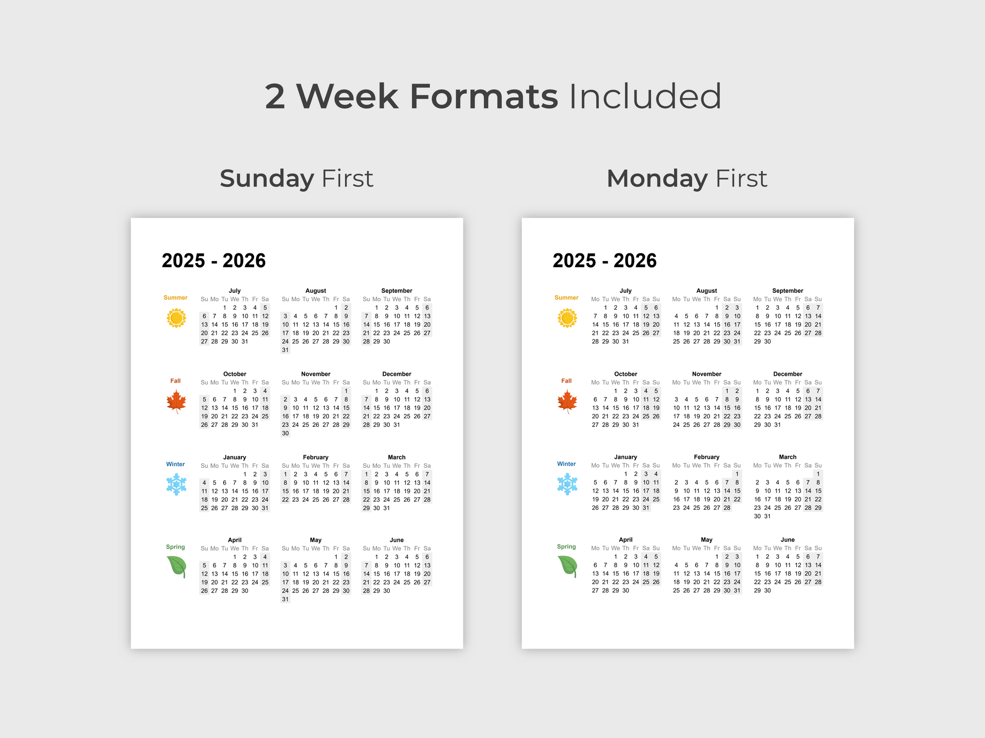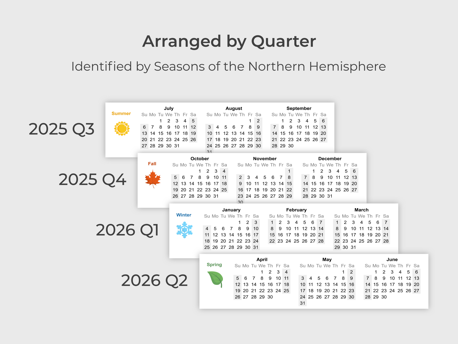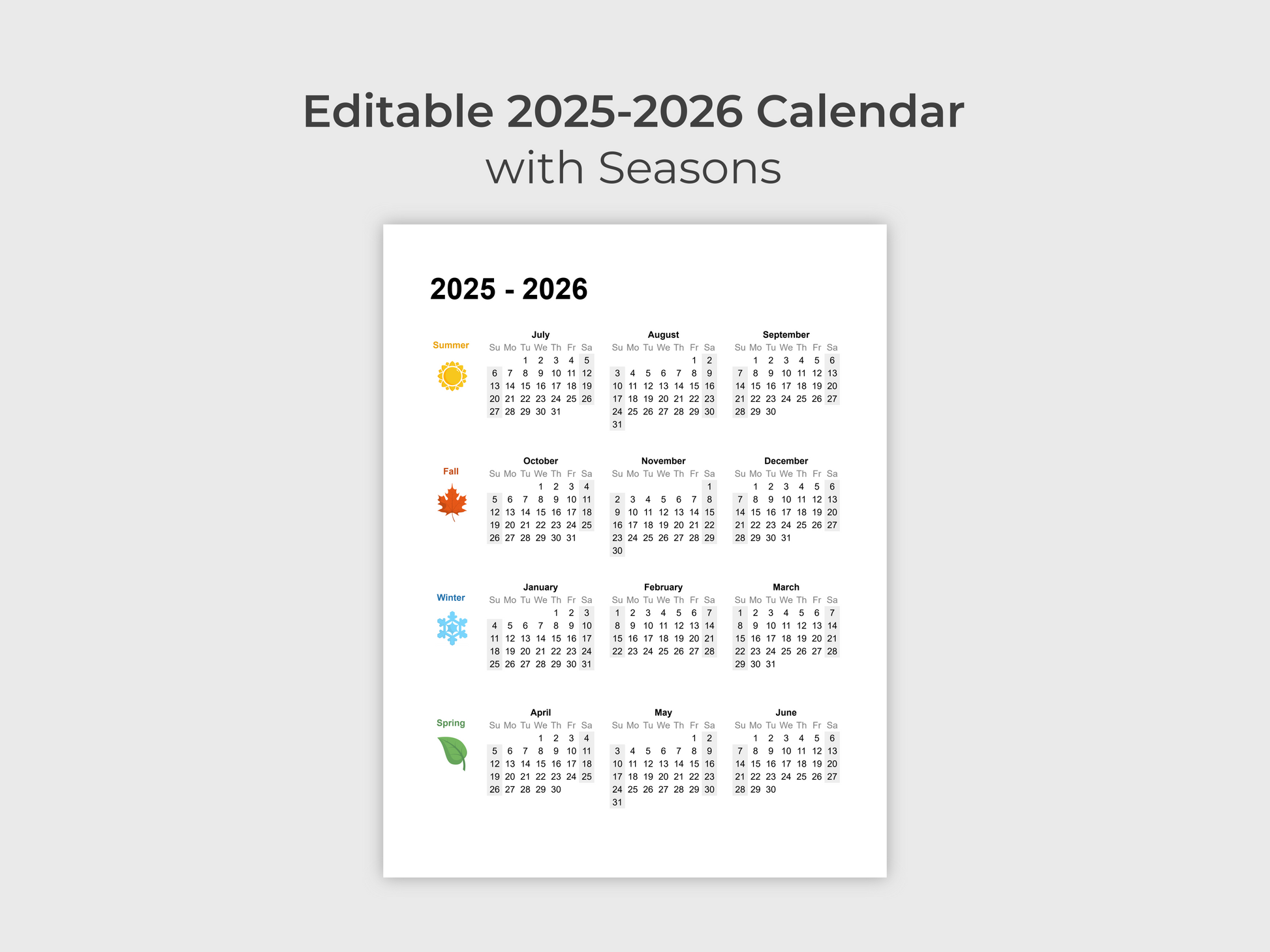 Clean and simple 2025-2026 school-year calendar. Easy to print off and pin to the wall. Good for crossing off the dates as they pass. It's organized into 4 quarters aligned with the seasons for quick reference at a glance.