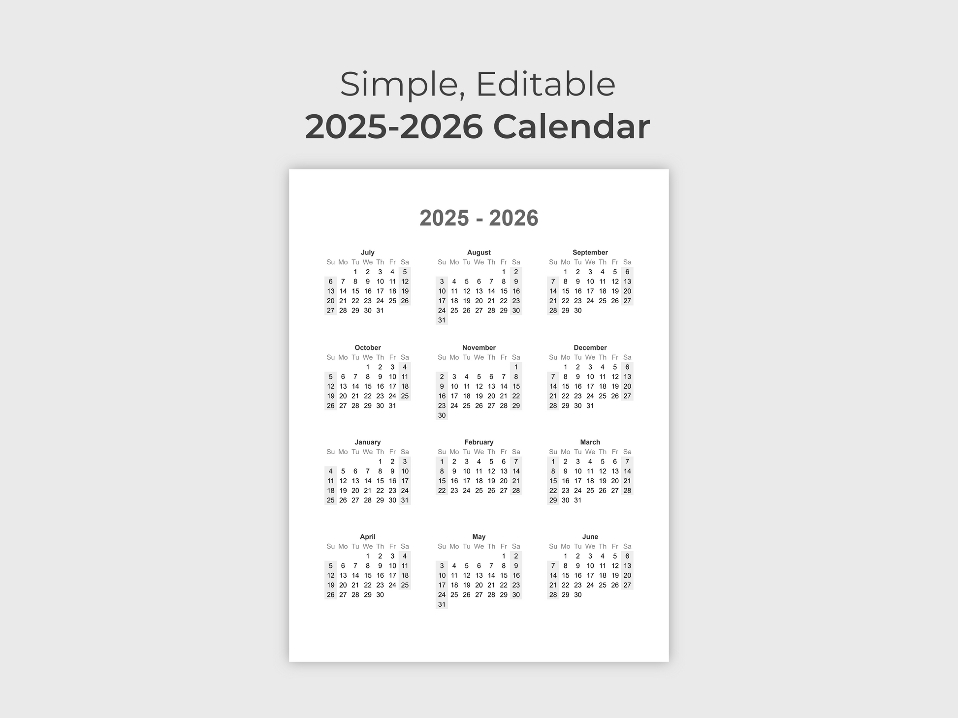 Clean and simple 2025-2026 school-year calendar. Easy to print off and pin to the wall. Good for crossing off the dates as they pass. It's organized into 4 quarters for quick reference at a glance.