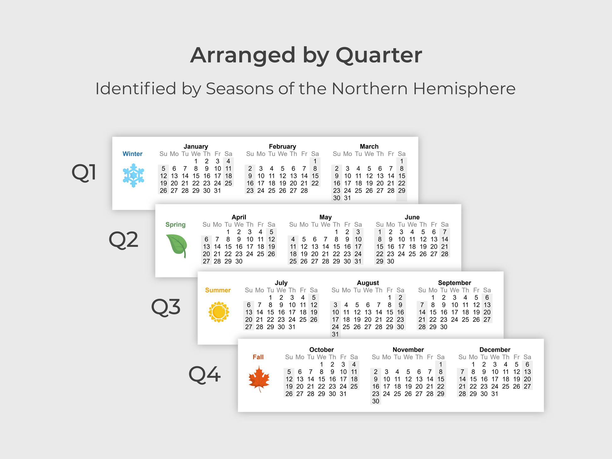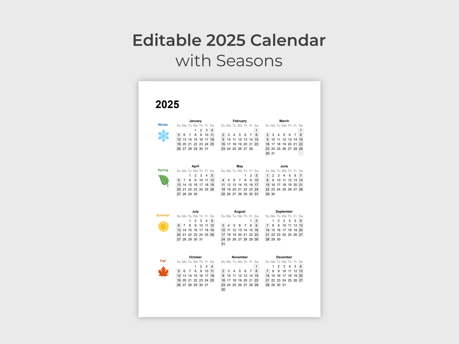 Clean and simple 2025 full-year calendar. Easy to print off and pin to the wall. Good for crossing off the dates as they pass. It's organized into 4 quarters aligned with the seasons for quick reference at a glance.